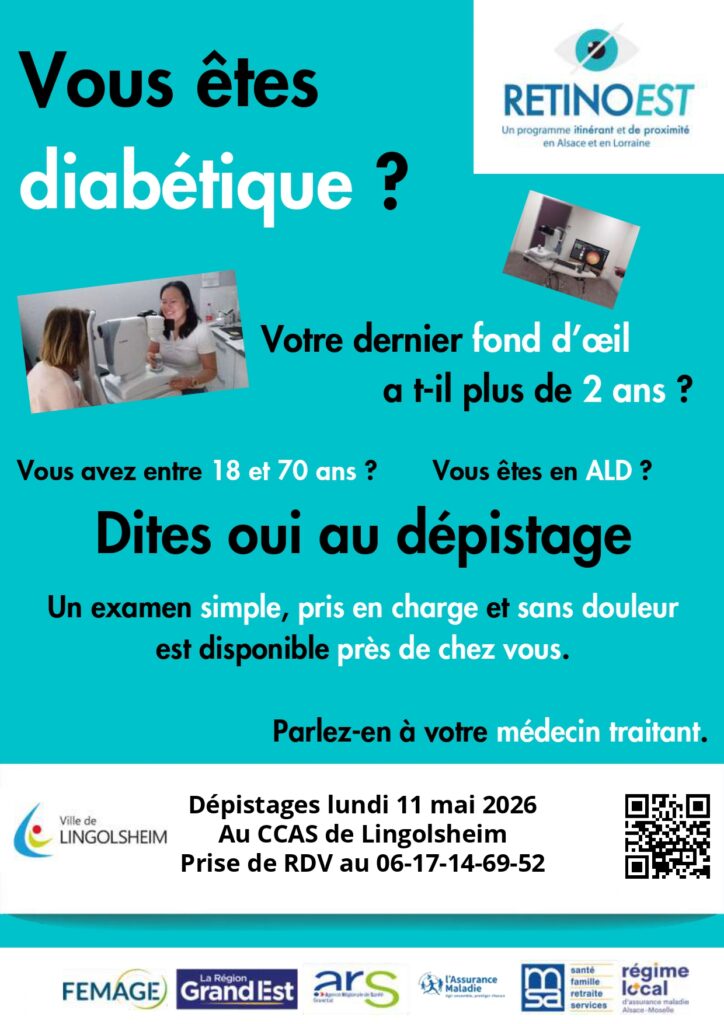 Le programme de dépistage de la rétinopathie diabétique propose un dépistage gratuit le 11 mai 2026 à Lingolsheim, au C.C.A.S.